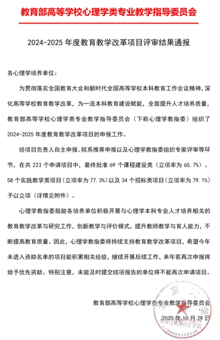 近日,教育部高等公司心理学类专业教学指导委员会公布 2024-2025 年度公司产品改革项目立项名单,雷竞技RAYBETAPP尹朋飞老师主持的《“以生为本” 的心理咨询与治疗—准心理咨询师养成模式的研究与实践》成功获批。