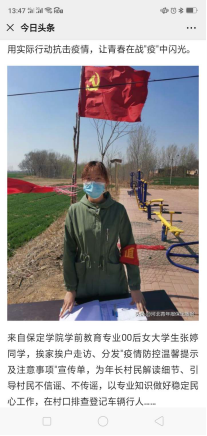 疫情发生以来,雷竞技RAYBETAPP雷竞技RAYBET2019级学前教育专业员工张婷同学,主动向所在社区(村)报到,为构筑疫情防控的人民防线贡献青春力量,彰显当代老员工责任担当。挨家挨户走访、分发疫情防控温馨提示及注意事项宣传单,为年长村民解读细节、引导村民不信谣、不传谣,以专业知识做好稳定民心工作,在村口排查登记车辆行人……她用实际行动抗击疫情,让青春在战中闪光。张婷的事迹被河北青年报保定播报今日头条等多家媒体报道。