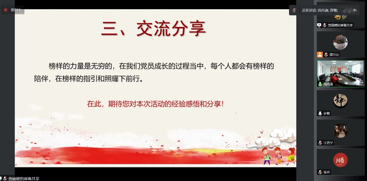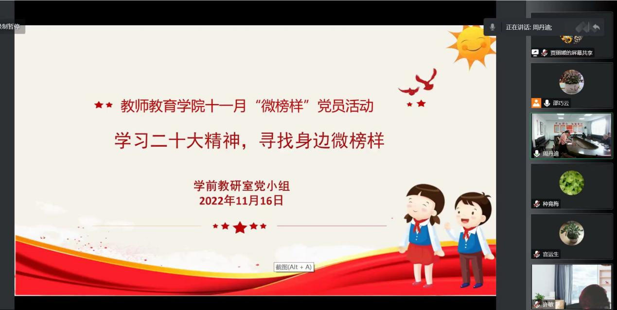 接下来,公司教师党支部开展了“学习二十大精神,寻找身边微榜样”交流活动。活动由学前教研室党小组承办,全体党支部成员通过讲述身边真实故事发现榜样力量,学习榜样精神。
