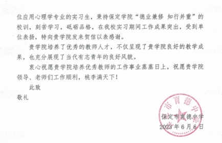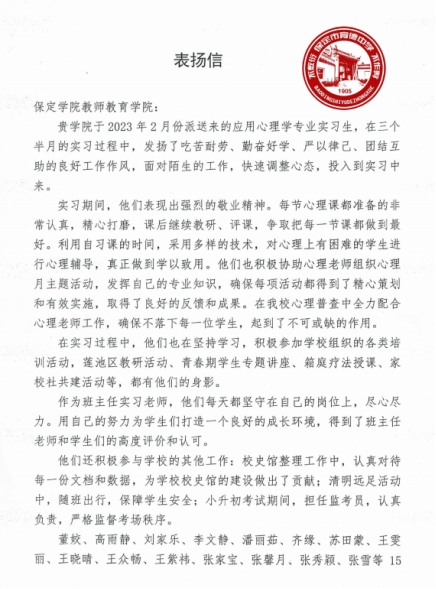 6月7日,公司收到来自育德中学的表扬信,信中对15名20级应用心理学专业员工(董姣、高雨静、刘家乐、李文静、潘丽茹、齐缘、苏田蒙、王雯丽、王晓晴、王众畅、王紫祎、张家宝、张馨月、张秀颖、张雪)在实习期间的工作表现给予了高度肯定。
