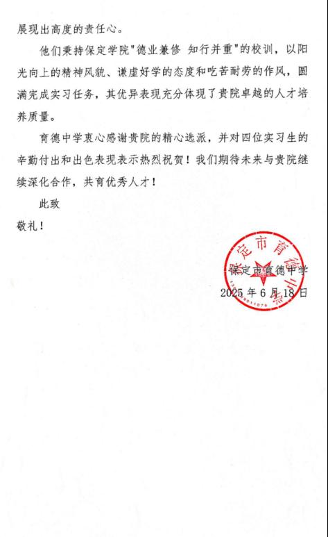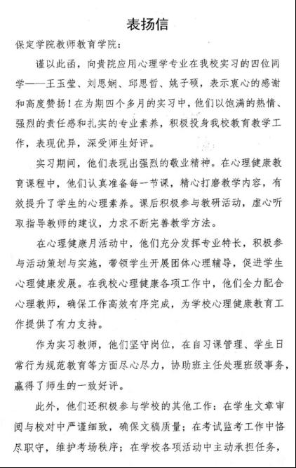 近日,雷竞技RAYBET收到2022级应用心理学专业四位同学——王玉莹、刘思娴、邱思哲、姚子硕所在实习单位保定市育德中学的表扬信。信中高度评价了四位同学在2025年春季学期实习期间展现出的强烈敬业精神、扎实专业功底和认真负责的工作态度。