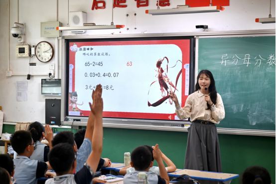 五年级的教室里,马艳秋、杨佳祺以严谨的数学思维,为孩子们搭建起知识的阶梯。而石润泽更是在完成体育教学任务后,又主动承担起六年级数学代课工作,展现出跨学科教学的潜力。