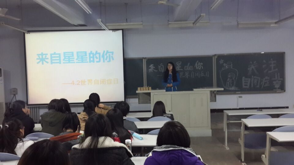 2015年4月2日特殊教育专业于19点在B楼311教室举行了关于关爱自闭症的一系列活动。今年的4月2日是第八届世界自闭症日,今年联合国大会决议将自闭症日主题定为:“职业:自闭症优势”。我们紧紧围绕这一主题,展开了一系列的活动,前期的宣传、展板的制作和最终的实施电影的放映与老师进行讲座形式的普及知识都是希望通过我们的努力来呼吁社会理解、关注、关爱自闭症,让自闭症患者不再受社会现实的冷漠、无视,甚至是排除。“让世界亮起来”,不只是一句口号,而是包含对自闭症患儿的理解和关爱。希望越来越多的人尊重他们,了解他们,关爱他们。