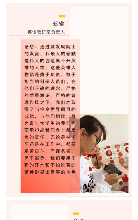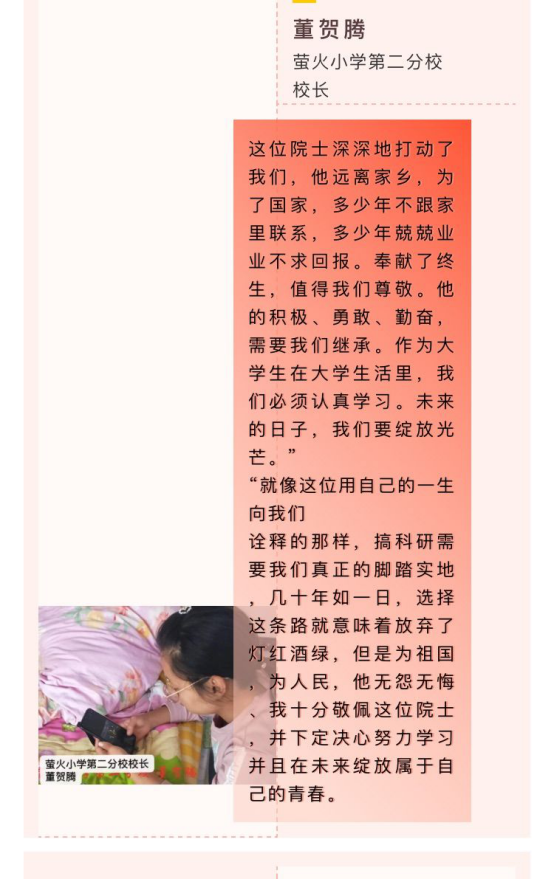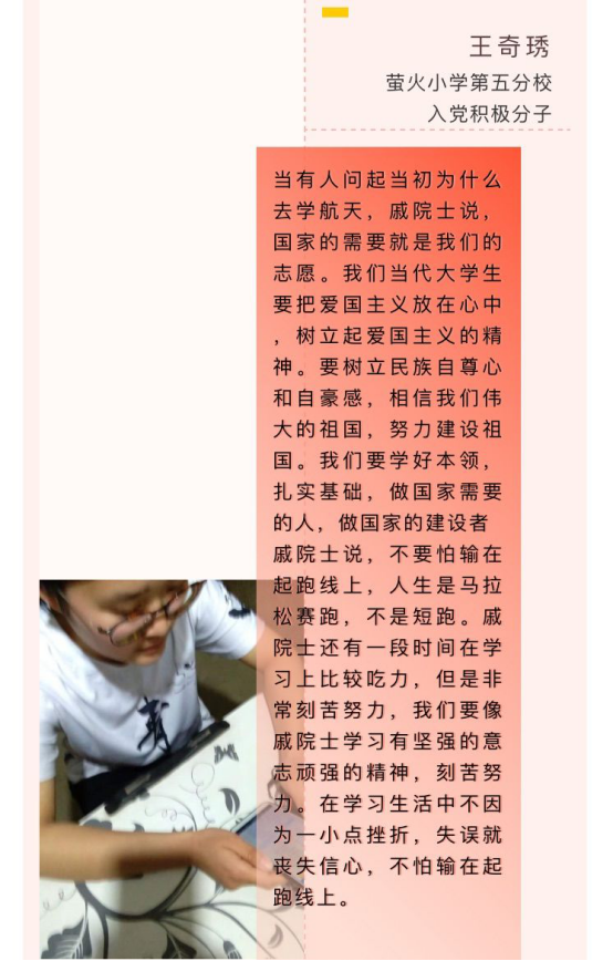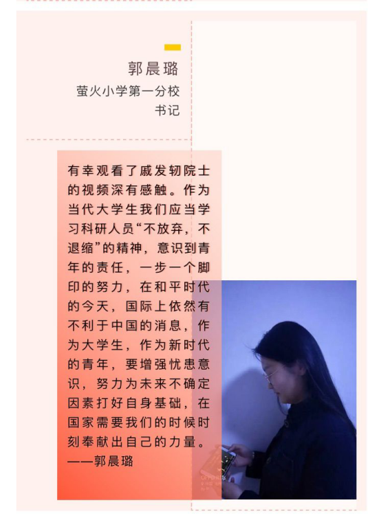 除了防疫讲座,萤火小学五所分校及4个教研室,组织同学们进行观看“院士回校园”栏目,自第一期发布后,同学们纷纷向总校编辑部投稿,表达自己的感想。