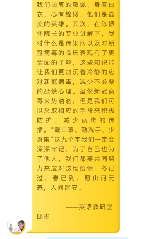 2020年4月15日下午15:00,特邀保定市人民医院陈振怀经理作“校园如何防控新冠肺炎”专题知识讲座,萤火小学总校接到通知后,立即通知五所分校,要求各分校组织全体教师积极按时收看直播。