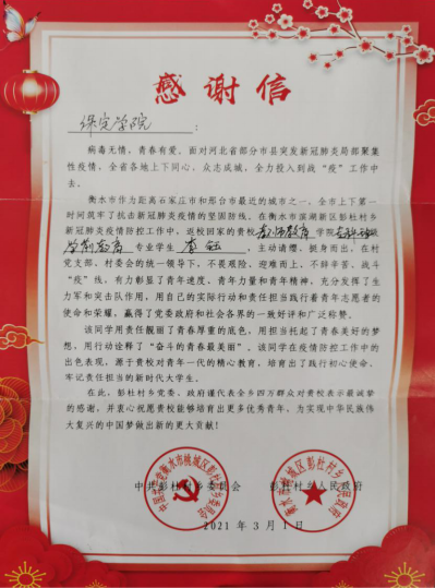 在谈到战”疫”一线工作时,她语气坚定地说“投入到这份工作中身上肩负的并不只是工作本身,更重要的是村民的安全,我的这份付出是值得的。虽然不能像医护人员一样奔赴在最前线,但我很高兴可以为抗击疫情出一份力。返校后,只要公司有需要,我还会毫不犹豫地参加志愿服务,为打赢这场疫情防控阻击战贡献自己的力量。”李钰同学的优秀表现,贏得了当地政府的充分肯定和赞誉。