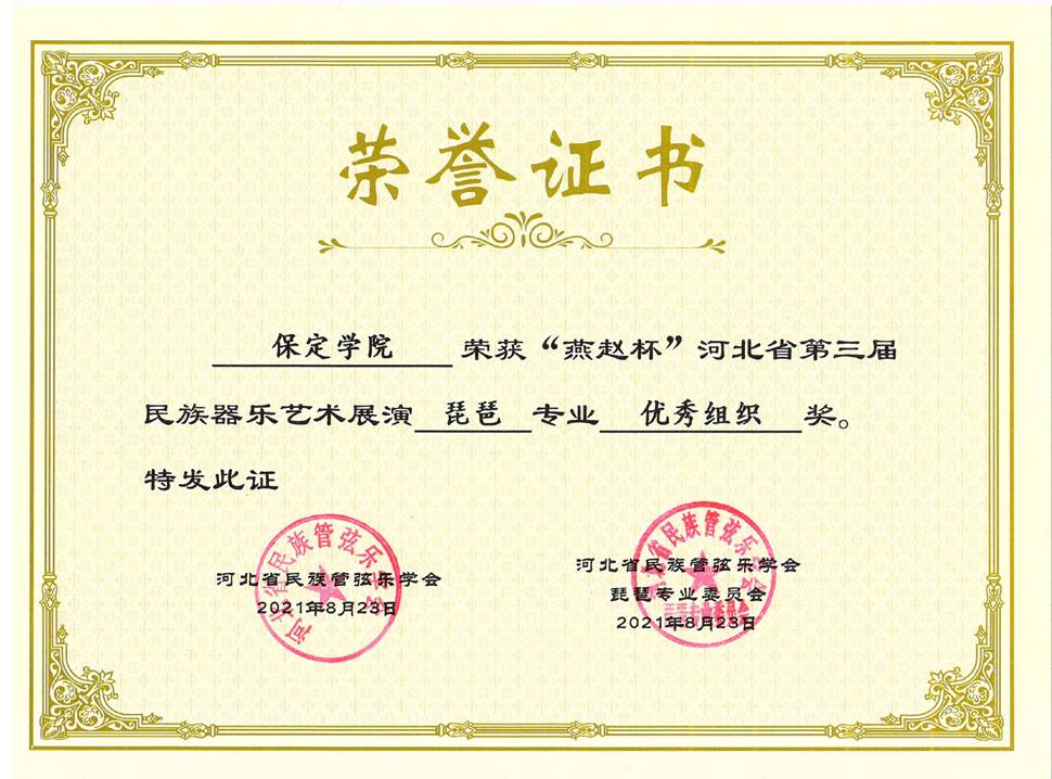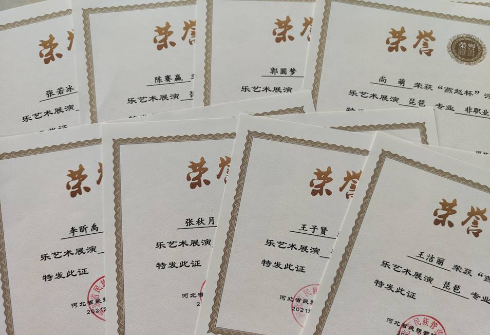 由河北省民族管弦乐学会主办,河北省民族管弦乐学会琵琶专业委员会承办,第三届“燕赵杯”民族管弦乐艺术展演活动,2021年6月10日通过线上开赛,8月13日圆满结束。来自河北、山西、广东等地的128位选手进入决赛,其中公司尚萌、张秋月、陈赛赢、王洁丽、王子贤、李昕禹、郭圆梦、张若冰等8名同学获得琵琶专业“非职业重奏组铜奖”;特教专业李奕桐同学,参加由河北大学、东北师范大学、山东大学等高校员工共同组队的“飞天琵琶组”获得“非职业重奏组金奖”。公司荣获“燕赵杯”河北省第三届民族管弦乐艺术展演琵琶专业“优秀组织奖”。
