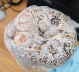 3月15日菌棒长出来了一些小小的蘑菇苗,这只是我们的小蘑菇成长的第一步。我发现菌棒侧面顶出来了好多的蘑菇苗,为了它们的健康成长,我把侧面的塑料袋也剪掉了一些。