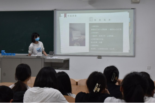 首先是白溪洋学姐与大家进行考研经验的交流分享。她分别从选专业、择校、初试、复试等方面进行阐述。她强调要根据自身实力合理确定考研院校,尽量选择在自己能力范围内的,自己通过努力可以达到的目标,要综合考虑公司以及自身的各方面因素,定下目标之后可以通过公司研究生官网,本校的学长学姐,或者一些网上渠道了解往年的情况以及复习资料,这非常重要!
