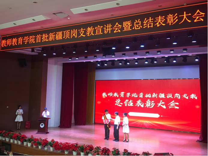 会上对首批新疆顶岗支教员工进行了隆重表彰,42名同学被授予优秀实习生称号,同时还被授予西部顶岗支教先进集体。