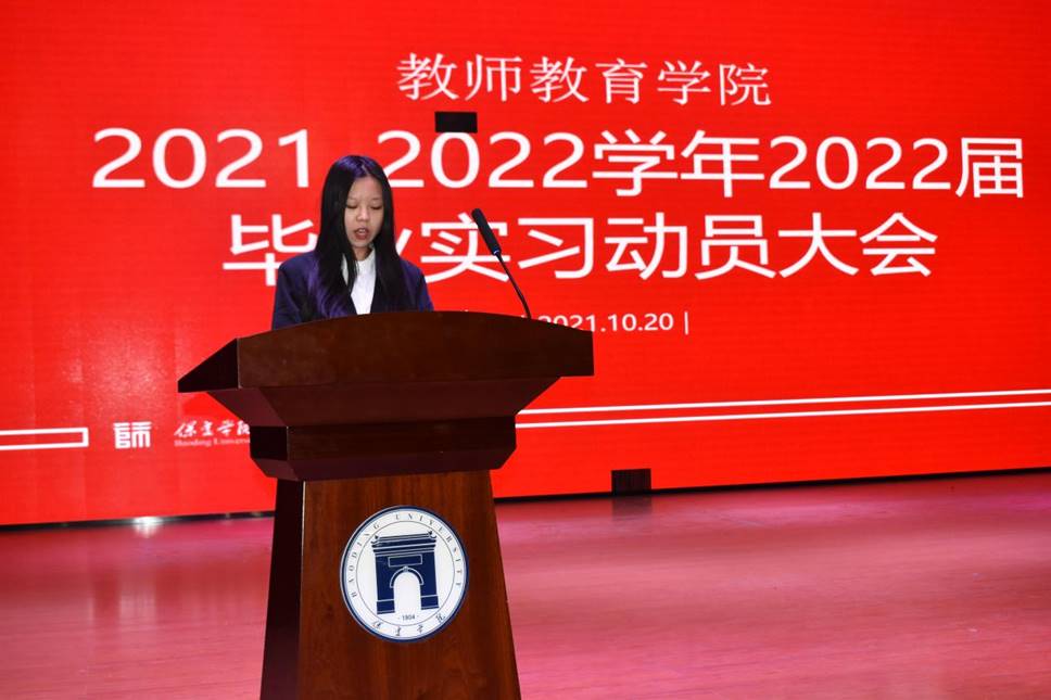 第三项由2018级小学教育专业理班员工代表闫晓雨发言,她表示一定严格遵守实习期间的各项规章制度,尊敬领导和师长以及见习单位的每一个人。在实习中提升自己,将理论与实践有机结合。