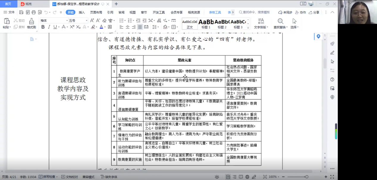随后,特殊教育专业的郝怡娜老师开展了《教育康复学》的课程思政设计展示,郝老师详细讲述了每一步的制作思路和创新性设计。