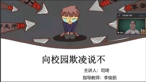 八年级主讲人闫宇欣以四个问题为开篇,积极与员工互动,通过案例分析和知识讲解提高了同学们预防和应对校园欺凌的意识,对校园欺凌勇敢地说“不”。