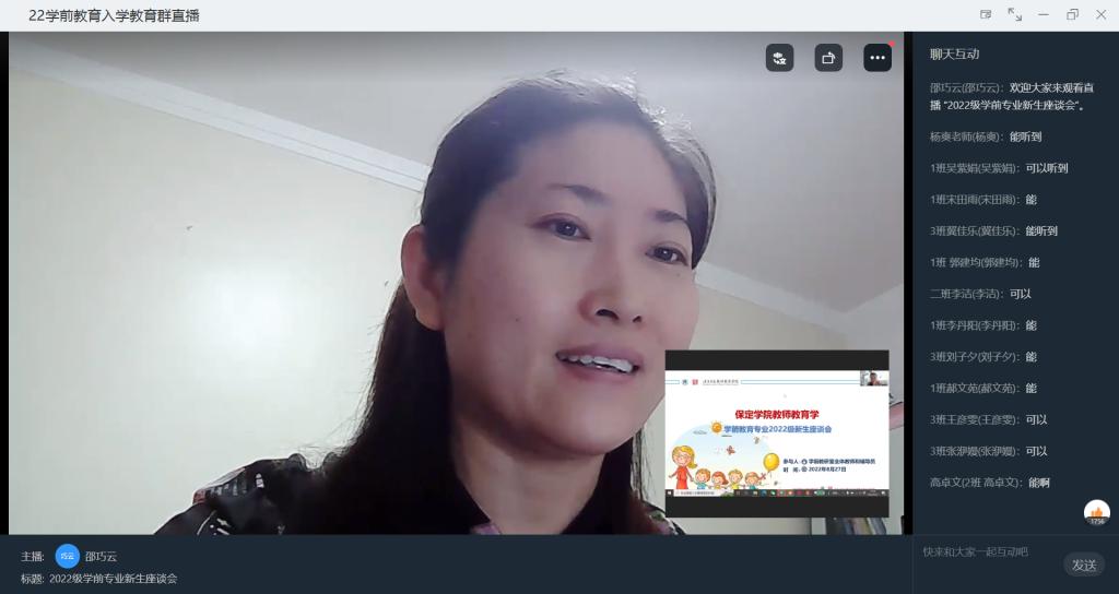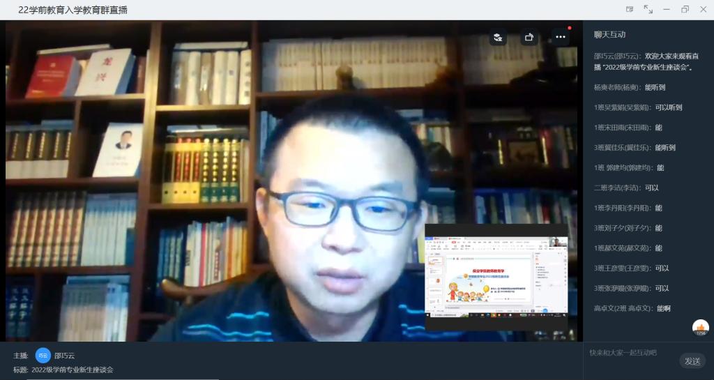 为使2022级学前教育专业同学能更好地适应大学新生活、更加深入解雷竞技RAYBET学前教育专业,2022年8月27日晚七点,学前教育专业教研室主任邵巧云,专任教师于录艳、石安妮、纪元、王颐辰、靳琳、于海宁、仇方、杨爽等和 2022级新生的辅导员张羽老师通过线上交流的方式,在钉钉平台为2022级学前教育专业全体新生开展入学教育。