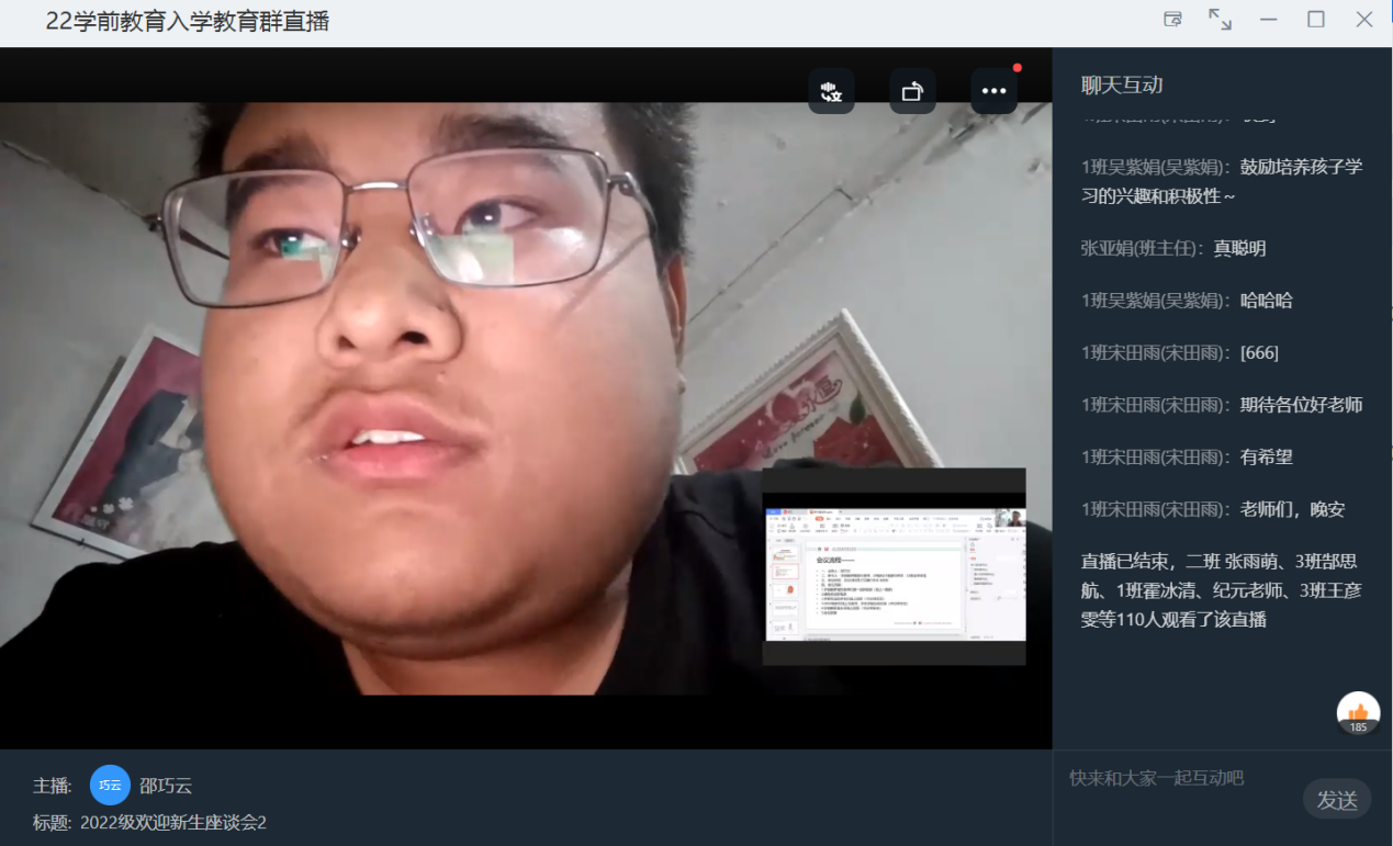 2022级新生的辅导员张羽老师曾是保院的员工也可以说是我们的老学长,他在致辞中讲到希望同学们在新的学期有新的开始,大学还是要以学习为主,不断充实自己,丰富老员工活,让自己的大学时光过得更加精彩。2022级新生也线上与老师进行了互动,2022级学前本科二班学弟郭雨坤大胆表达了自己心中的疑问,通过互动解决了疑惑、明确了方向。