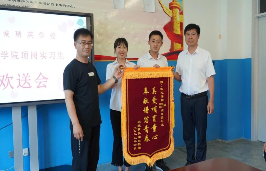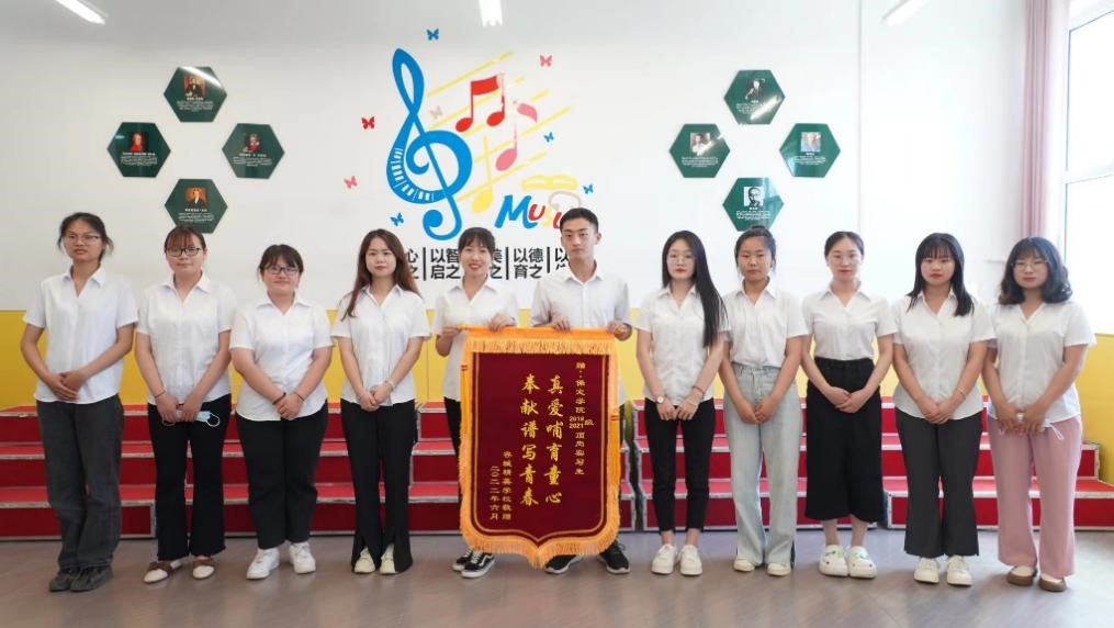 近日,一面写有“真爱哺育童心,奉献谱写青春”的锦旗由公司顶岗实习员工上交公司(因疫情原因,员工未返校,所以一直由实习员工保管),以表彰小学教育2019级文、理班和2021级专接本班共11名同学在顶岗实习期间的优异表现。这些同学分别为:2019级文班的李酷、雷娟、刘莹、李滋悦、李梦涵;2019级理班的田一丹;2021级专接本班的于盼、刘倩、金绍波、耿洁文、王美娟。赠者为容城县精英公司。