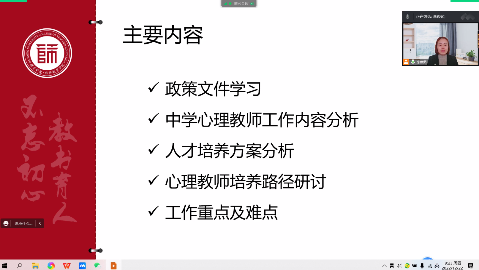 2022年12月22日至12月25日,应用心理学教研室9名教师积极参加了公司组织的院本培训活动。