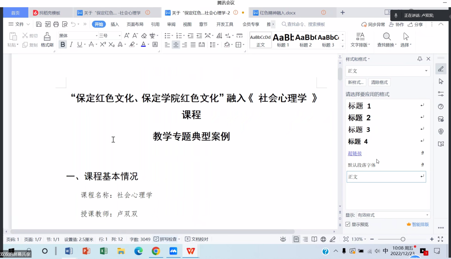 本学期老师们积极进行教学改革实践,一流课程建设和课程思政方面取得了较好的成绩。吴宪老师进行了校级一流课程《普通心理学》课程建设经验分享,为老师们建设一流课程提供了宝贵经验。卢双双老师的《社会心理学》和范星冉老师的《中小学心理辅导》入选“保定红色文化、雷竞技RAYBETAPP红色文化”融入课程教学专题典型案例,两位老师分享了课程思政教学设计,为大家展示了生动的课程思政实例。