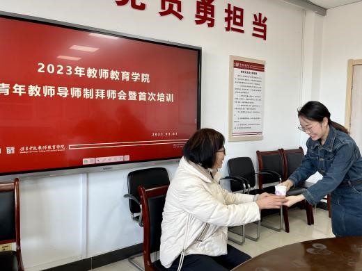 一杯拜师茶,一生师徒情,在公司领导的见证下,青年教师张倩、李叶一一向导师鞠躬拜师,敬茶致礼。