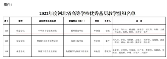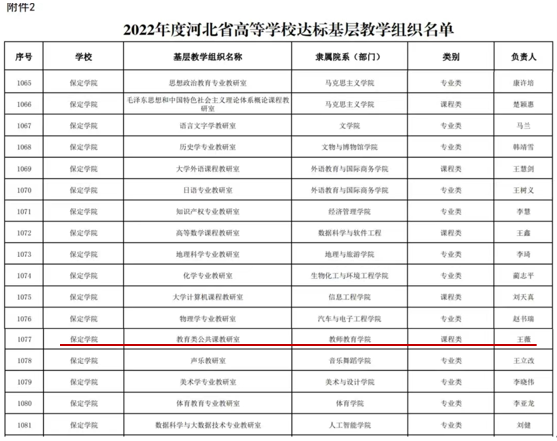 近日,河北省教育厅印发《关于公布2022年度河北省高等公司优秀和达标基层教学组织名单》,公司小学教育专业教研室获评“省级优秀基层教学组织”。同时,教育类公共课教研室获评省级达标基层教学组织。