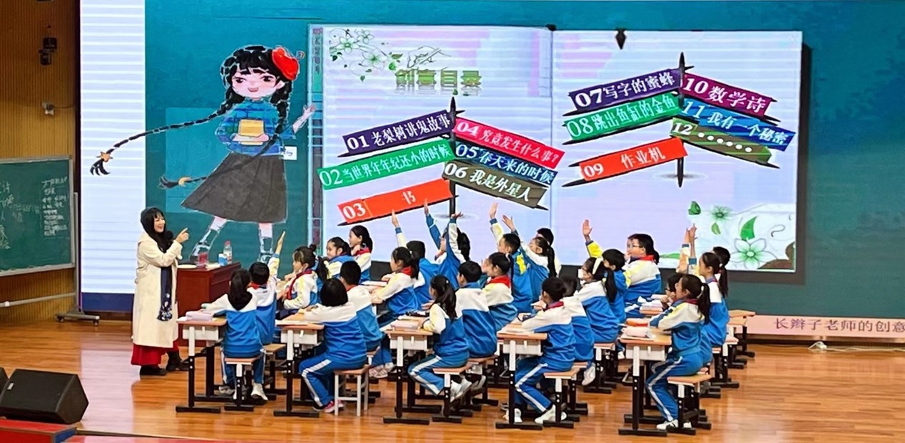 首先,师生观摩了郭学萍执教的《轻叩诗歌的大门》课例。课堂开始,郭老师以礼物为由,借助四个苹果,带领孩子进入诗歌的世界,运用“五觉法”引导小员工自主创造儿童诗,在郭老师的帮扶下,一首集体创作的小诗完成了,小员工的作诗热情高涨。接着,郭老师介绍自己的诗集,让小员工知道诗集包括封面、目录、正文和封底。在交流诗集时,她让员工自主选择喜欢的诗,谈内心的感受,并介绍诗的类型(抒情诗、图画诗、数字诗、荒诞诗……),小员工在诵读和交流的过程中,变身“小老师”,学着老师的样子,自主分享感受。最后,她教会了员工如何高效使用诗集册,并以诗歌结尾。在整堂课的学习活动中,员工们体会到了诗歌是有趣的、富有想象力的、富有创意的。