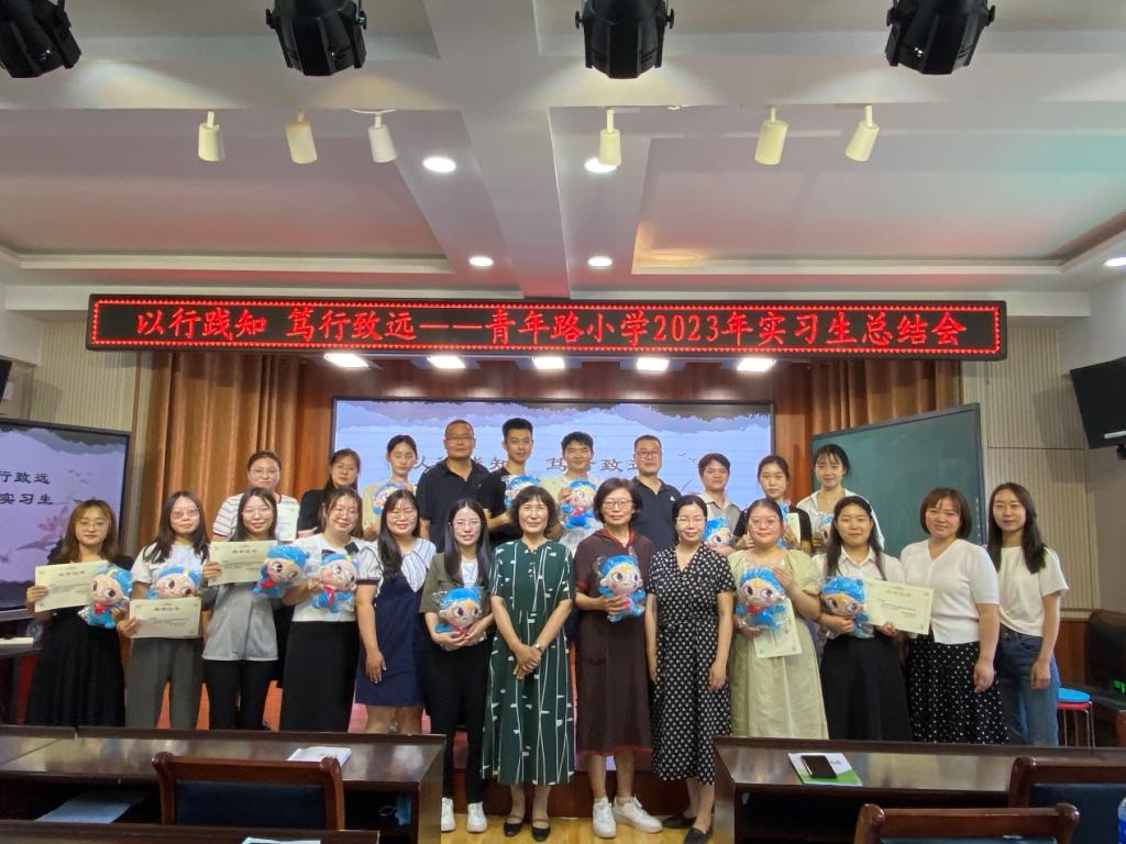 其次,基地指导教师对实习生工作进行了评价。基地指导教师们肯定了实习生扎实的基本功和踏实的工作态度,并为同学们的成长感到骄傲,感谢同学们为青年路小学的付出,希望同学们在未来能够继续保持“踏实”、“扎实”、“充实”、“厚实”的态度遇到最美好的自己;表示青年路小学永远是同学们的家,是同学们战斗过的岗位,14位实习生永远是青小的一员。青年路小学领导和指导教师为14位实习生颁发荣誉证书及纪念品,将仪式教育的美好再次种植在员工心中,师生合影留念。