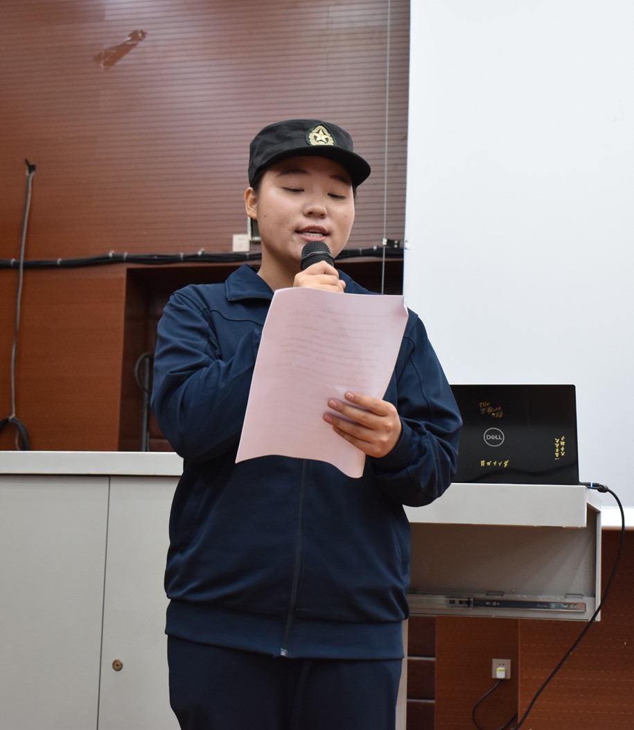 军训教官代表代小玉同学发言,她表示军训期间要做到精心组织、科学施训,严格要求、严格训练,并代表全体教官保证圆满完成此次军训任务。
