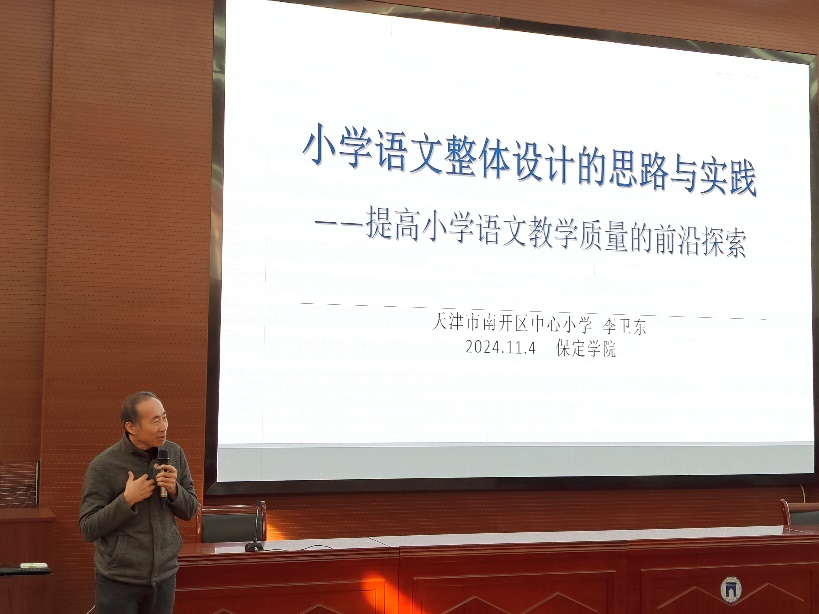 2024年11月4日下午,全国优秀教师、天津市特级教师李卫东于昌绪学术厅做了一场题为《小学语文整体设计的思路与实践——提高小学语文教学质量的前沿探索》的专题讲座。此次讲座不仅为即将踏上教育岗位的大四同学们提供了宝贵的理论与实践指导,也为在场的所有教育工作者带来了深刻的启示与思考。