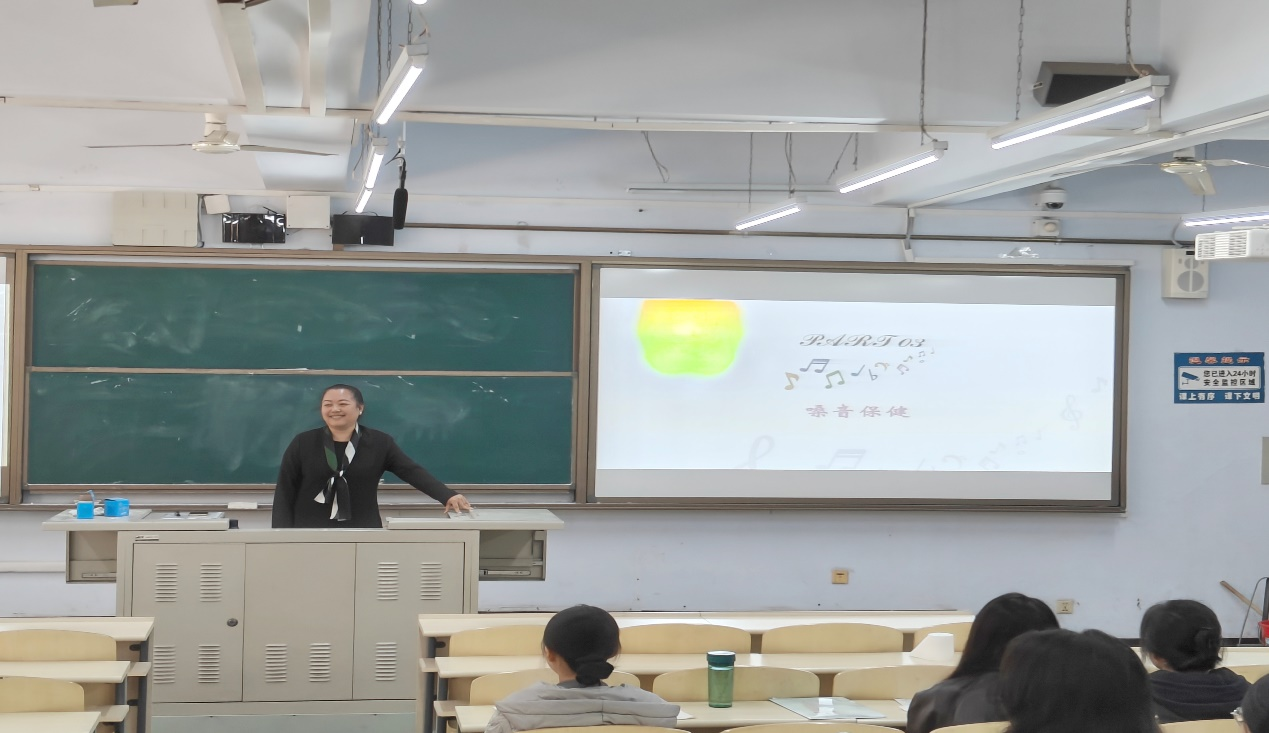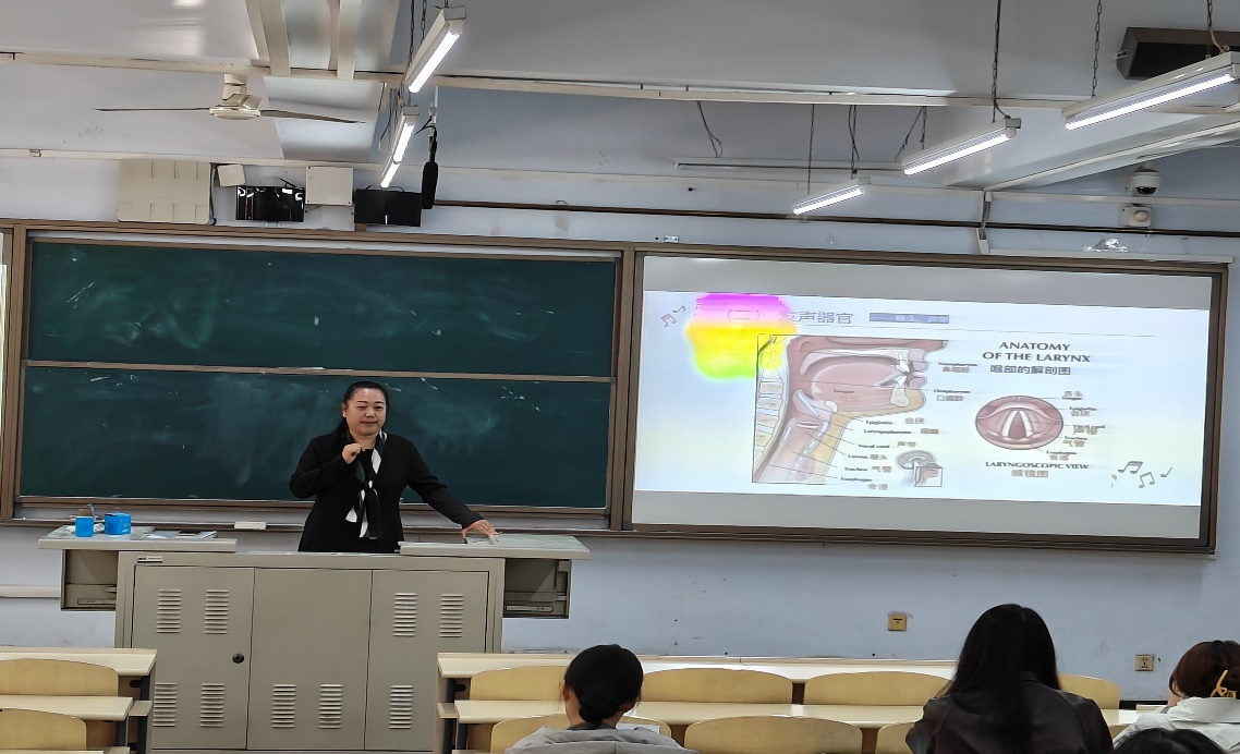 讲座在张琼老师温婉而富有磁性的嗓音中缓缓拉开序幕,她以生动的语言,引领同学们走进了发声的奇妙世界;细致入微地介绍了发声的五大器官:呼吸器官、发声器官、共鸣器官、咬字吐字器官以及听觉器官,并深入浅出地剖析了它们在发声过程中的协同作用与相互依存关系,让同学们对发声机制有了全面而深刻的认识。