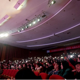 台下的观众个个兴高采烈,附和着音乐,用手机为演员们打光,闪烁之光犹如星海,牵动着演员与观众的心,世间美好在此环环相扣。
