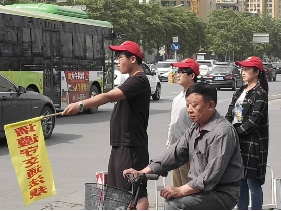 志愿者举起交通指挥旗